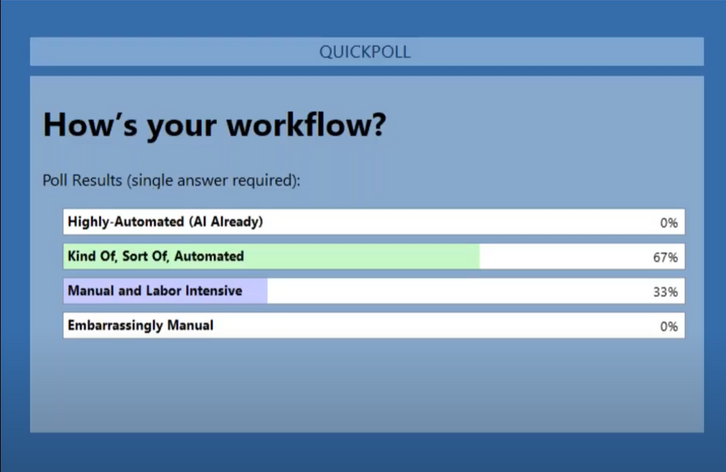 Heldigvis var det ingen som svarte at arbeidsflyten deres var manuell, men det var heller ingen som sa at prosessene var 100% automatisert, ei heller at de anvendte kunstig intelligens (AI) for å forbedre arbeidsflyten. Det plasserte deltakerne i en av to kategorier: