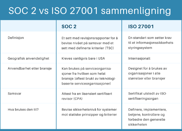 Propell.ai jobber med flere store regnskapsbyråer som er underlagt globale sikkerhetskrav og leverandørkontroll. Når vi snakker med sikkerhetssjefen i disse selskapene er vi ofte i dialog med noen i USA, India og andre land som kjenner bedre til og som ser SOC 2 som en bedre sertifisering enn ISO27001, siden SOC 2 er mer rettet mot sikkerhet av systemer.